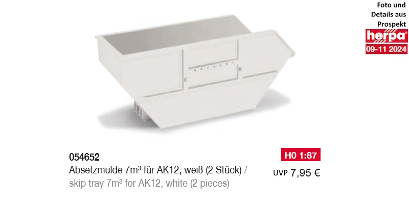 Besonders zur Ausschmückung von Dioramen sowie als Ladegut für entsprechende LKW werden die neuen Absetzmulden in der größeren Bauform in Weiß als Set mit zwei Stück angeboten.