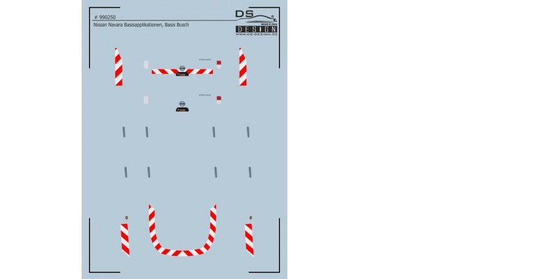 Das Decal # 990250 bildet die Basisapplikationen für den Nissan Navara der Fa. Busch ab. So können Sie also nach der Lackierung Ihr Modell entsprechend vervollständigen. Ebenfalls sind in diesem Decal auch entsprechende vorbildkonforme Rückleuchtenimitationen und Warnmarkierungen für den kommunalen Einsatz enthalten.