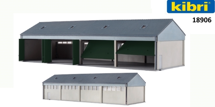 Dieser vorbildgerechte Garagenbau bietet eine ansprechende Unterbringung für mindestens 4 Lastwagen oder Einsatzfahrzeuge. Das Gebäude eignet sich hervorragend zur Inszenierung von Kasernenbetrieb und dazugehöriger Logistik. Die 4 breiten Rolltor-Nachbildungen erlauben auch das Einfahren von Lastwagen mit Plane. Die Innenlänge reicht aus für ein ca. 8 cm langes Fahrzeug. Mit Stecksystem.