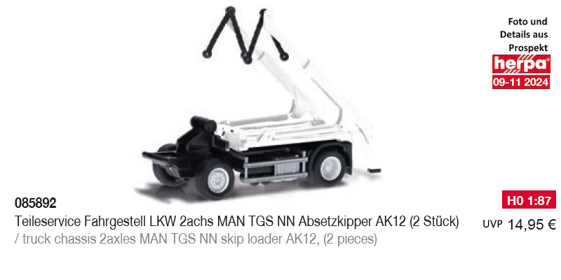 Mit einem Fahrgestell für MAN TGS NN Fahrerhäuser wird der neue Meiller Absetzkipper AK12 in der zweiachsigen Variante ohne Fahrerhaus als Herpa MiniKit angeboten.