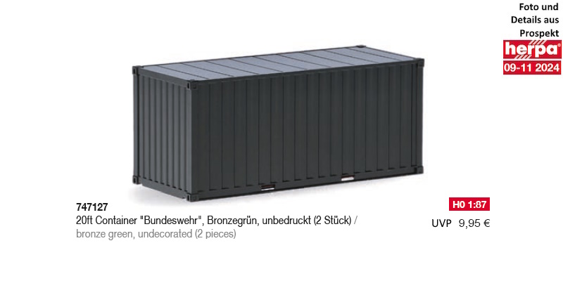 Als Zubehör werden die 20 ft. Container in bronzegrüner Farbgebung für Bundeswehr Militärfahrzeuge im Set mit zwei Stück produziert.