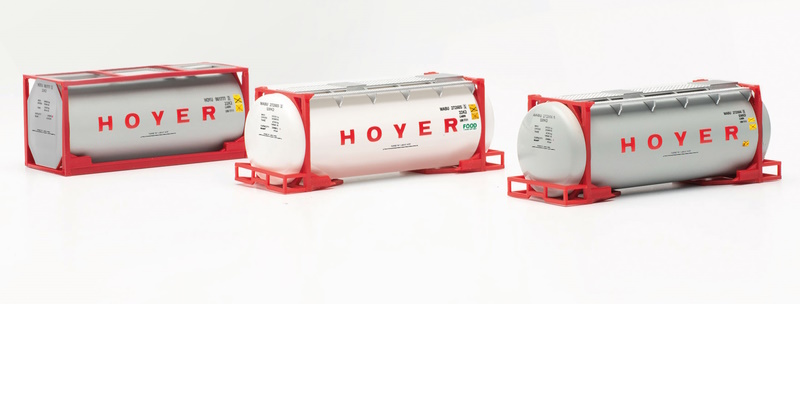 Inzwischen mit dem Index -006 kommt nun das Tankcontainer-Set in den Farben der Hamburger Hoyer Group. Die drei Container sind nach aktuell gültigem CI gefertigt und tragen eine vorbildkonforme Containernummer nach ISO 6346, bestehend aus dem dreistelligen Eigentümerschlüssel (Buchstaben A–Z), dem Produktgruppenschlüssel (U,J,Z,R) einer sechsstelligen Seriennummer sowie einer aus allen 10 Zeichen und Stellen errechneten Prüfziffer. Letztere dient dazu, Fehleingaben durch Zahlendreher auszuschließen. Parallel zu diesem Set erscheint ein Volvo Sattelzug (316316), ebenfalls im aktuellen CI.