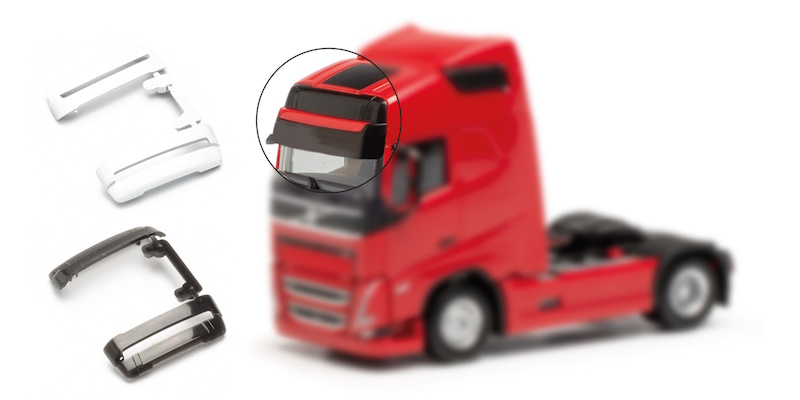 Jeder Volvo Trucker, der seinen Job und vor allem sein Fahrzeug liebt und viel Zeit darin verbringt, baut das ein oder andere um. Ein beliebtes Upgrade ist die breite Sonnenblende für die 4. und 5. Generation, die nun auch in 1:87 erhältlich ist. Das Set beinhaltet je 4 weiße und schwarze Sonnenblenden, sowie die längeren Frontspiegel.