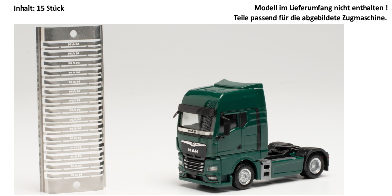 New type! As a brass etched part, a new type of accessory is now available for the Herpa tractor units. Often mounted as a design element on the original, this grille is declared as a stone guard for the windshield. Herpa has developed the accessories for the tractors of Iveco, MAN, Mercedes-Benz, Scania, and Volvo, each engraved with the brand name as well as with other design elements and adapted to the respective curvature of the windshield. Each accessories set includes 15 silver brass etched parts, which are simply plugged in behind the A-pillar of the respective tractor.