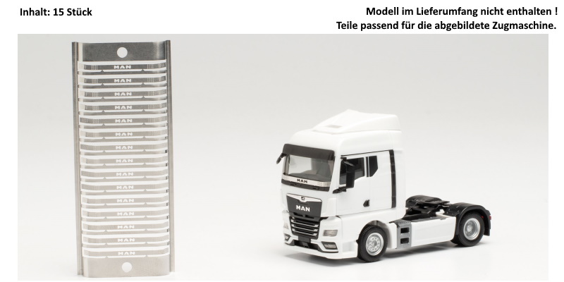 New type! As a brass etched part, a new type of accessory is now available for the Herpa tractor units. Often mounted as a design element on the original, this grille is declared as a stone guard for the windshield. Herpa has developed the accessories for the tractors of Iveco, MAN, Mercedes-Benz, Scania, and Volvo, each engraved with the brand name as well as with other design elements and adapted to the respective curvature of the windshield. Each accessories set includes 15 silver brass etched parts, which are simply plugged in behind the A-pillar of the respective tractor.