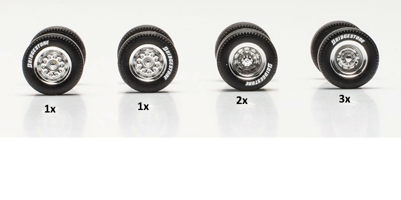 Mit diesem Zubehörset der bedruckten BRIDGESTONE-Reifen auf Chromfelgen kann man wahlweise eine Zugmaschine oder einen Motorwagen (2achs oder 3achs) und einen Anhänger oder Auflieger (2achs oder 3achs) umrüsten. Das Set beinhaltet eine Lenkachse, sowie eine Vor-/Nachlaufachse (mit minimal schmälerer Achse) und zwei Zwillingsachsen die für das Zugfahrzeug herzunehmen sind. Mit den drei verbleibenden Achsen ist dann der Hänger/Auflieger auszustatten.