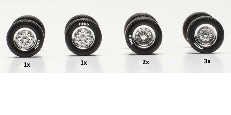 Mit diesem Zubehörset der bedruckten PIRELLI-Reifen auf Chromfelgen kann man wahlweise eine Zugmaschine oder einen Motorwagen (2achs oder 3achs) und einen Anhänger oder Auflieger (2achs oder 3achs) umrüsten. Das Set beinhaltet eine Lenkachse, sowie eine Vor-/Nachlaufachse (mit minimal schmälerer Achse) und zwei Zwillingsachsen die für das Zugfahrzeug herzunehmen sind. Mit den drei verbleibenden Achsen ist dann der Hänger/Auflieger auszustatten.