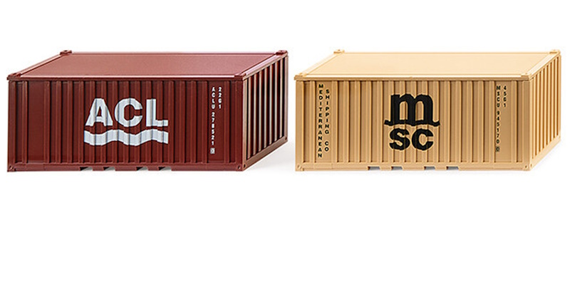 Die Container-Logistik erhält Verstärkung Ohne Container geht es nicht! WIKING ergänzt rechtzeitig zur Vorstellung des Seitenstaplers das Programm mit zwei zeitgenössischen 20'-Containern. Schon zum Ende der 1960er-Jahre hatte sich WIKING dieses neuen Logistikthemas angenommen und damit thematische Akzente gesetzt, die bis heute Wirkung entfalten. Die Modellbauer miniaturisierten über die Jahrzehnte hinweg immer wieder Containerauflieger mit wechselnden Zugmaschinen. Hinzu kamen zahlreiche Industrieaufträge, die die Transportboxen für WIKING-Freunde noch attraktiver machten. 20'-Container I: alle Bauteile sandgelb gehalten mit seitlicher Bedruckung „MSC“. 20'-Container II: Container oxidrot mit weißem Schriftzug „ACL“.