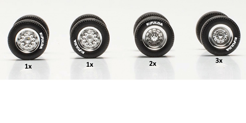 Mit diesem Zubehörset der bedruckten FULDA-Reifen auf Chromfelgen kann man wahlweise eine Zugmaschine oder einen Motorwagen (2achs oder 3achs) und einen Anhänger oder Auflieger (2achs oder 3achs) umrüsten. Das Set beinhaltet eine Lenkachse, sowie eine Vor-/Nachlaufachse (mit minimal schmälerer Achse) und zwei Zwillingsachsen die für das Zugfahrzeug herzunehmen sind. Mit den drei verbleibenden Achsen ist dann der Hänger/Auflieger auszustatten.